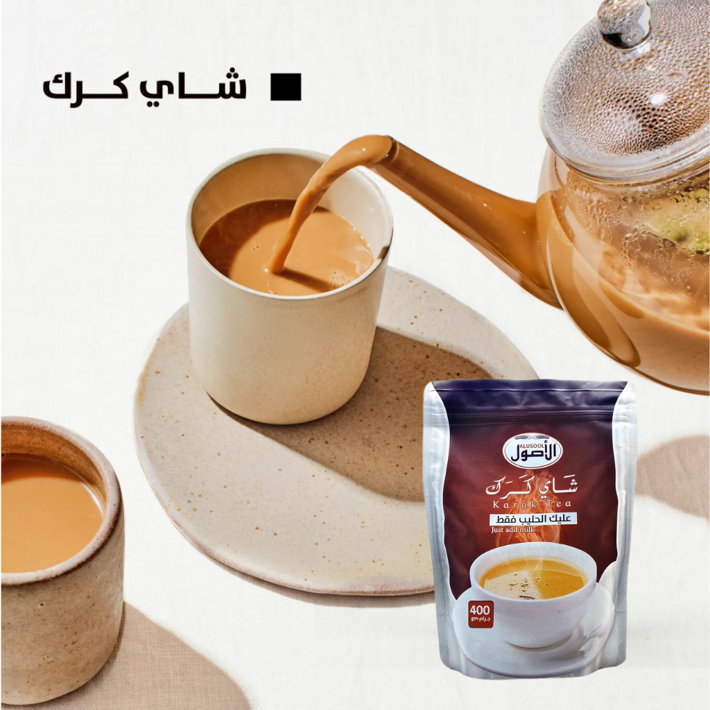 معلومة شاي كرك الأصول لا يحتاج أي إضافات فقط الحليب مكونات شاي الكرك (شاي الأصول)1-شاي فاخر2-قرفة 3- هيل درجة أولى4خلطة الأصول5قرنفل 6 -سكر طريقة التحضير يغلى شاي الكرك (شاي كرك الأصول) على نار هادئة لفترة وجيزة ولا يحتاج الى أي إضافات إلى أن تتركز النكهة، ثم يضاف إليه الحليب فقط، ويترك على نار هادئة لفترة أطول .